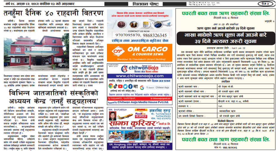 पचरती बचत तथा ऋण सहकारी संस्था लि. वाट ऋण लिनु भएको ऋणी सदस्यलाई ऋण चुक्ता गर्न आउने बारे ३५ दिने अत्यन्त जरुरी सार्बजनिक सूचना चितबन पोस्ट मिति २०८२।०७।२३ (प्रथम पटक प्रकाशित)
