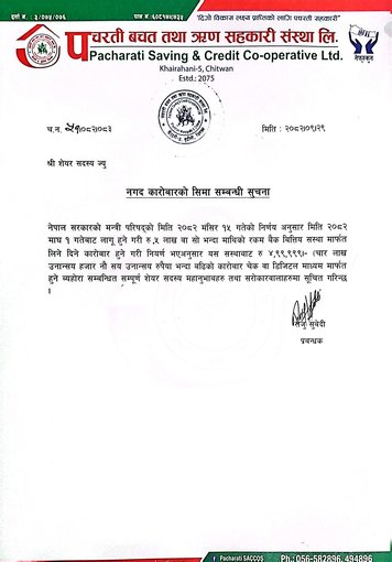 नेपाल सरकारको मन्त्री परिषद्को मिति २०८२ मंसिर १५ गतेको निर्णय अनुसार मिति २०८२ माघ १ गतेबाट लागू हुने गरी रु ५ लाख वा सो भन्दा माथिको रकम बैक बित्तिय सस्था मार्फत लिने दिने कारोबार हुने गरी नियर्ण भएअनुसार यस सस्थाबाट रु ४,९९,९९९।( (चार लाख उनान्सय हजार नौ सय उनान्सय रुपैया भन्दा बढिको कारोबार चेक वा डिजिटल माध्यम मार्फत हुने ब्यहोरा सम्बन्धित सम्पूर्ण शेयर सदस्य महानुभाबहरु तथा सरोकारवालाहरुमा सूचित गरिन्छ ।