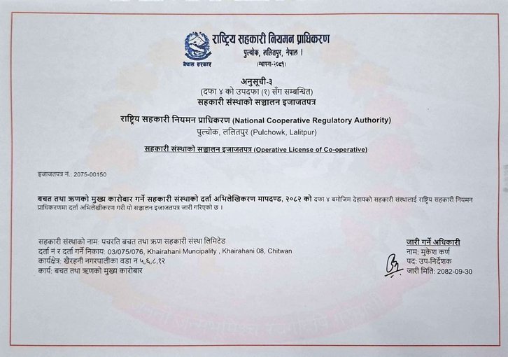 राष्ट्रिय सहकारी नियमन प्राधिकरणले जारी गरेको बचत तथा ऋणको मुख्य कारोवार गर्ने सहकारी संस्थाको दर्ता अभिलेखीकरण मापदण्ड २०८२ को दफा ४ बमोजिम यस पचरती साकोसले सहकारी संस्था सञ्चालन ईजाजतपत्र (Operative License) प्राप्त गरेको व्यहोरा सहर्ष जानकारी गराउँन चाहन्छौं ।